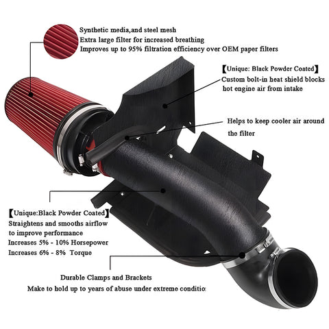 【Black heat shield】It's the ultimate performance cold air intake kit with a heat shield. The heat shield protects the filter from dirt and debris and keeps hot underhood air away from the element for a cooler intake air charge.