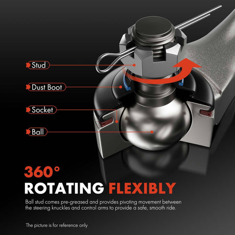【360°ROTATING FLEXIBLY】The ball stud comes pre-greased and provides pivoting movement between the steering knuckles and control arms to provide a safe, smooth ride.
