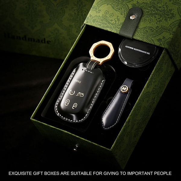 Gift Box Packaging: The product is uniformly packaged in a green gift box, making it a great gift. Gift box includes key cover + key chain, leather conditioning oil and instruction manual.
