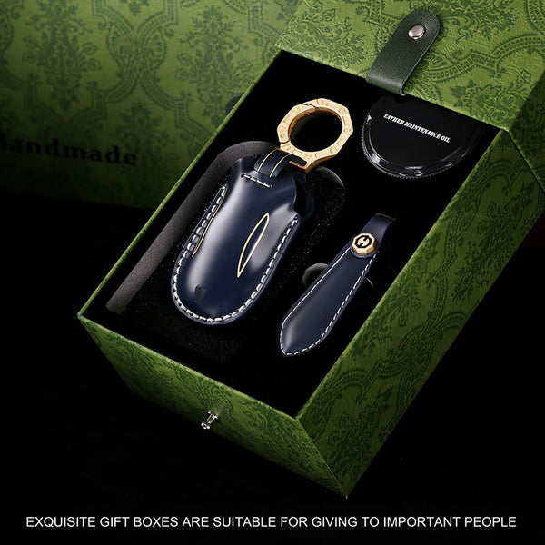 Gift Box Packaging: The product is uniformly packaged in a green gift box, making it a great gift. Gift box includes key cover + key chain, leather conditioning oil and instruction manual.