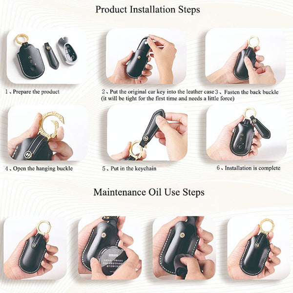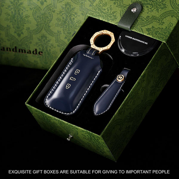Gift Box Packaging: The product is uniformly packaged in a green gift box, making it a great gift. Gift box includes key cover + key chain, leather conditioning oil and instruction manual.