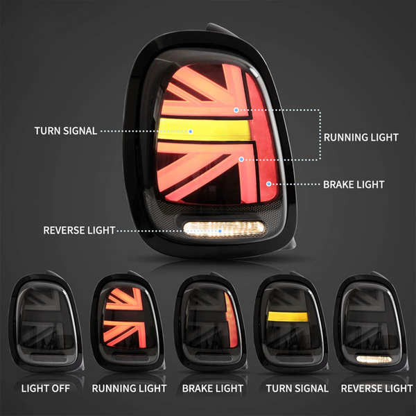 Lighting Display There are four different lighting effects for Mini Cooper taillights, including running lights, turn lights, brake lights, and reverse lights.