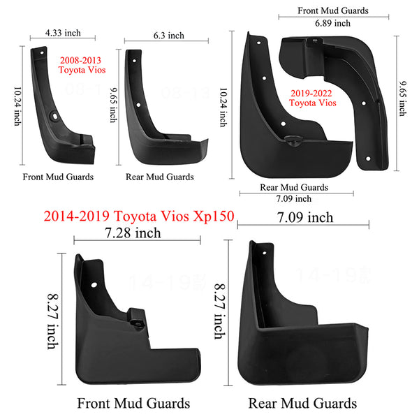 Mud Flaps for 2008-2022 Toyota Vios - Front & Rear Splash Guards (4 Pcs)